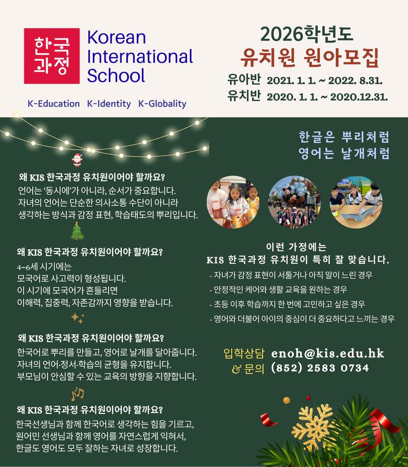 - [홍콩한국국제학교] ‘2025 Christmas Funfair’ 성황리 개최 홍콩한국국제학교(교장 송병근) 2025년 12월 19일(금), 전교생을 대상으로 ‘2025 Christmas Funfair’를 개최하며 한 해를 즐겁고 따뜻하게 마무리하는 뜻깊은 시간을 가졌다. 이번 크리스마스 펀 페어는 학생들이 크리스마스 분위기 속에서 다양한 놀이 활동에 참여하며 친구들과 추억을 나누는 체험형 축제로 꾸며졌다.이번 행사는 유치부와...