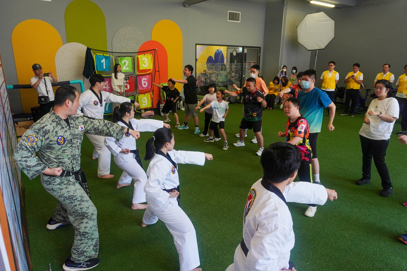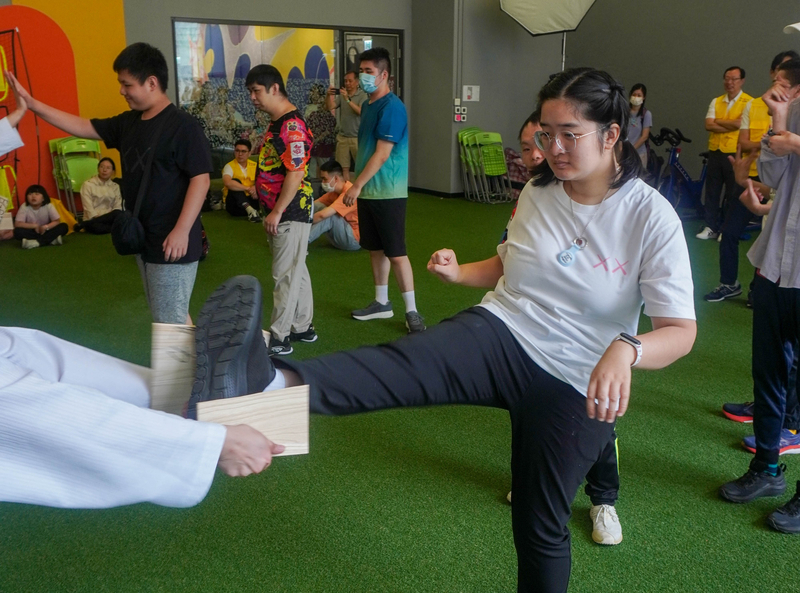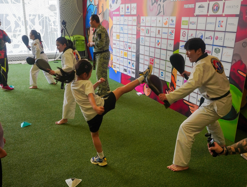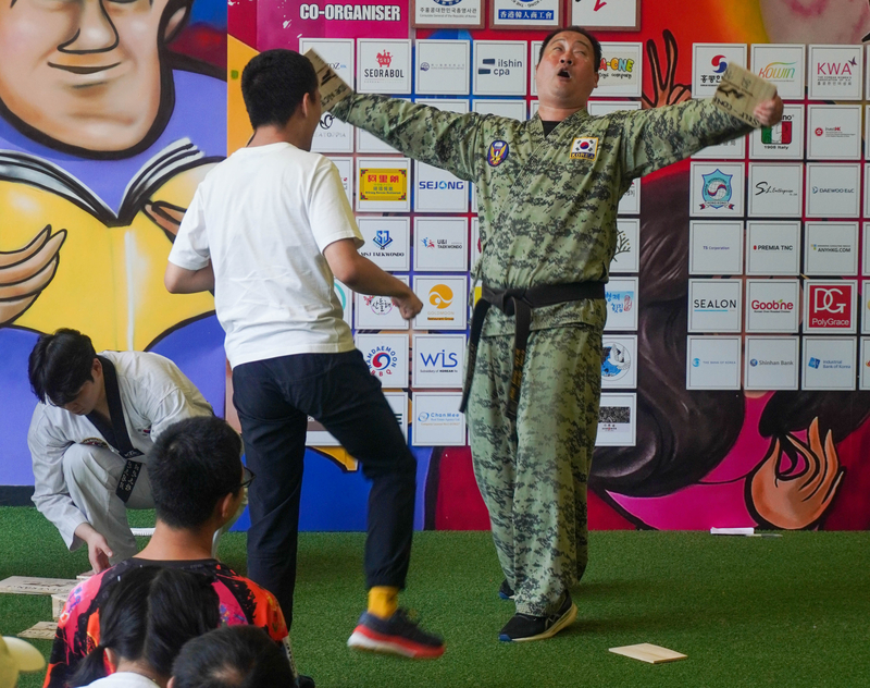 On the second floor venue, Taekwondo Master Cho Young-deuk and three instructors demonstrated poomsae, tumbling, board breaking, and performed the Baby Shark poomsae dance. Master Cho introduced Korean Taekwondo etiquette, taught the horse stance, punches and front kicks, and guided members through punching, kicking and board breaking exercises, encouraging them to "never give up and always try your best with confidence."