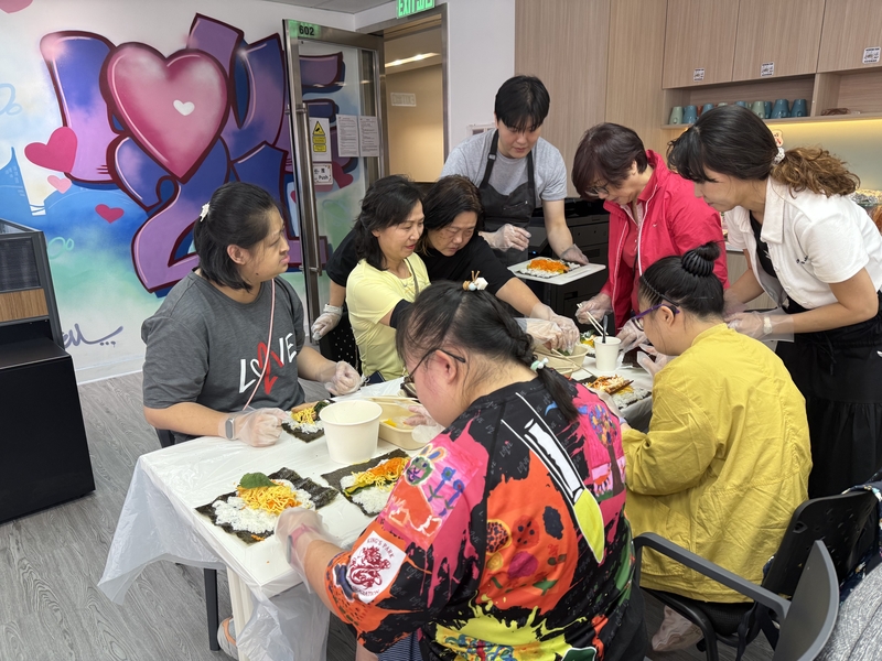 At Midas Plaza's 6th floor near the center, female executives from The Korean Chamber of Commerce in Hong Kong assisted Chef Choi Joon-woo (owner of O'rm) and partner Kim Dong-hee in teaching center members and parents how to make Korean gimbap and tteokbokki. Ting Ting's mother laughed as her daughter wanted to put so much more ingredients in her gimbap that the gimbap couldn’t be rolled.