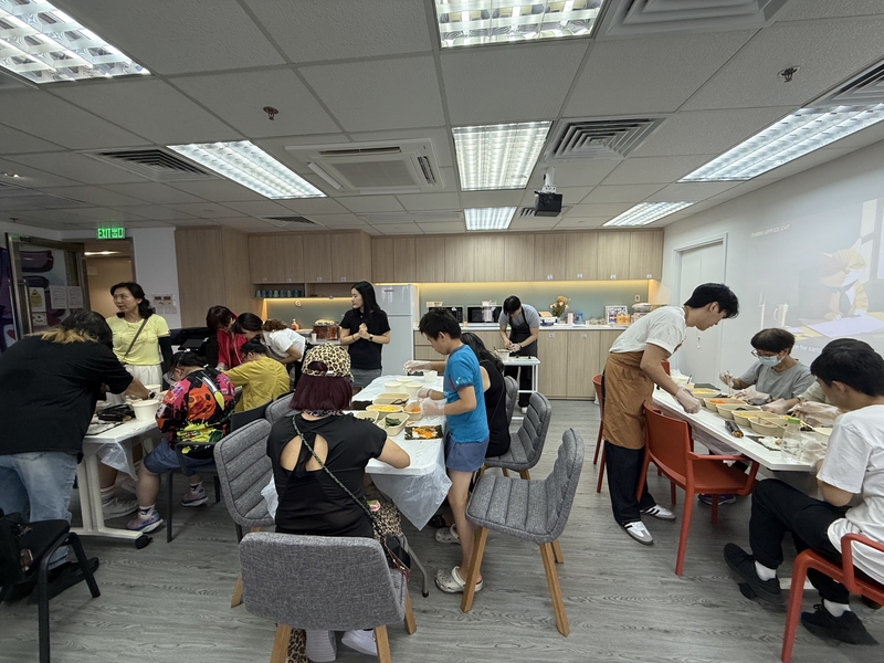 센터 부근 Midas Plaza 6층에서는 홍콩한인상공회 여성임원들이 O’rm owner 최준우 셰프와 김동희 파트너를 도와 센터 멤버와 부모들에게 한국식 김밥과 떡볶이 만드는 방법을 소개하고 함께 진행하였다. 멤버 중 탱탱(婷婷)의 엄마는 딸이 김밥에 올리고 싶은 재료가 너무 많아 김을 말 수가 없었다고 웃음을 터뜨렸다.