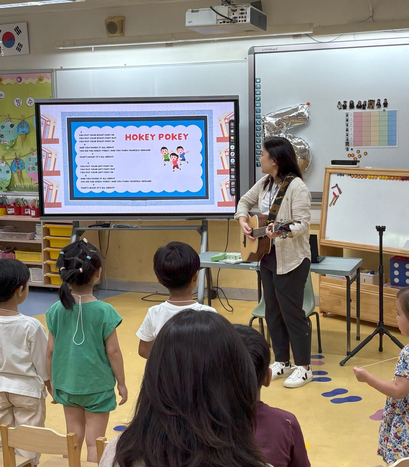 이어지는 영어 수업에서는 원어민 선생님의 흥미로운 스토리텔링과 함께 기타 연주가 더해져 학생들의 이목을 집중시켰습니다. 다양한 동화 이야기에 몰입하고, 경쾌한 노래를 부르며 신나는 춤을 추는 등 몸과 마음으로 영어를 체험했습니다. 학생들은 이러한 활기찬 활동을 통해 창의력과 상상력을 마음껏 발휘하며 영어 학습에 대한 흥미와 자신감을 키울 수 있었습니다.