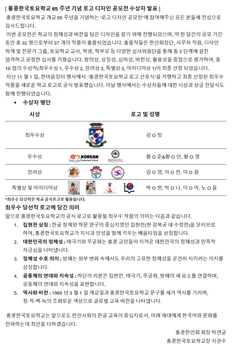 [홍콩한인회] 홍콩한국토요학교 65주년 기념 로고 디자인 공모전 수상자 발표