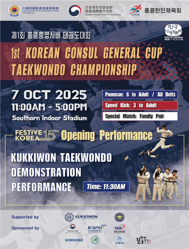 10월 7일(화) 홍콩 완차이 사우손 스타디움(Southorn Stadium)에서 열리는 『제1회 총영사배 태권도 대회』는 태권도를 배우고 있는 약 442명의 홍콩과 한국의 태권도 수련생이 품새와 스피드킥 대회를 통해 상호 경쟁과 우정을 다질 예정이다.