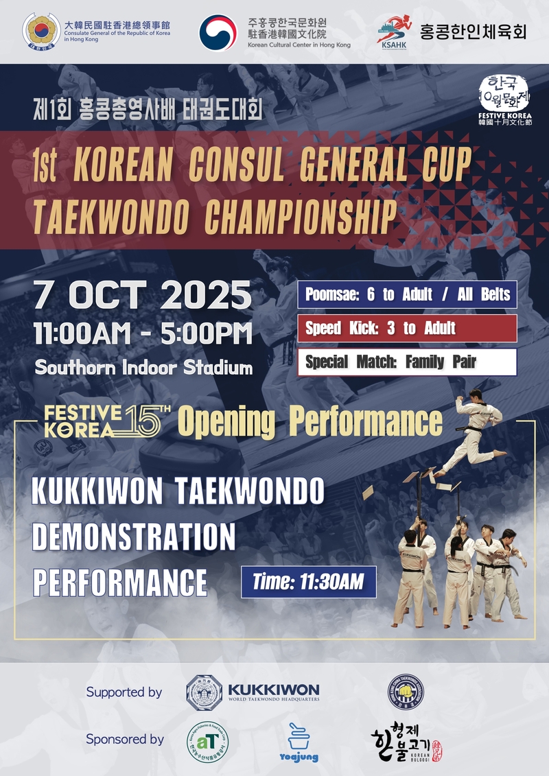 주홍콩대한민국총영사관(천성환 총영사 대리)이 주최하고 홍콩한인체육회(회장 한승희)가 주관한 제1회 홍콩총영사배 태권도대회가 지난 2025년 10월 7일(화) 오전 11시부터 오후 5시까지 성황리에 개최되었다.