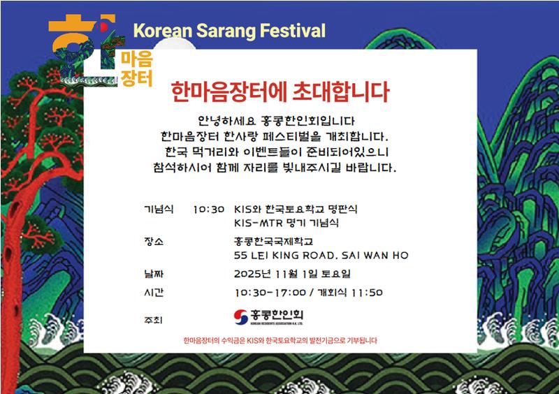 2025년 11월 1일, 홍콩한국국제학교(KIS) 운동장에서는 홍콩 한인사회의 가장 큰 연례 행사인 '한마음장터 한사랑 페스티벌'이 개최되었다. 주홍콩 대한민국 총영사관과 홍콩한인회(회장 탁연균)가 공동 주최한 이번 행사는 오전 10시 30분부터 오후 5시까지 진행되었으며, 어린아이부터 어르신에 이르기까지 모든 세대가 하나 되는 의미 있는 자리를 마련했다.