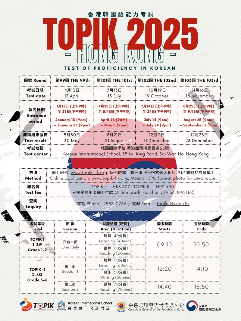 홍콩한국국제학교 한국과정(교장 송병근)은 한국어 학습자들에게 국제적으로 공인된 한국어 능력 인증 기회를 제공하기 위해 **TOPIK(한국어능력시험)**을 적극 운영하고 있습니다. TOPIK은 대한민국 교육부 산하 국립국제교육원이 주관하는 시험으로, 한국어 실력을 객관적으로 평가하고 인증하는 세계적인 시험입니다. 특히, TOPIK 성적은 한국대학 및 홍콩대학 진학, 기업 취업, 정부 기관 지원 등 다양한 분야에서 활용 가능해 수험생들에게 실질적인 혜택을 제공합니다.