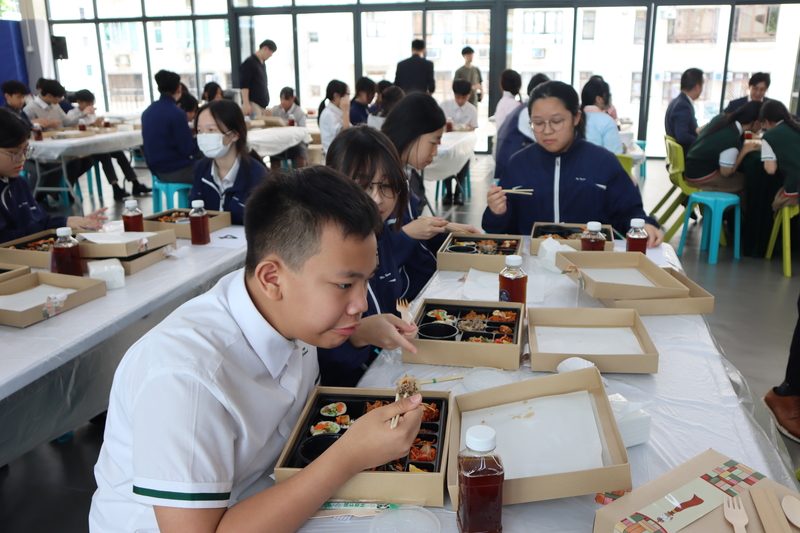 점심 시간에는 외교관의 대화 행사에 참석한 학생과 교직원 전원이 홍콩한국요식업협회(회장 : 이종석)측이 준비한 김밥, 잡채, 불고기, 닭강정, 제육볶음 등 다양한 한국 요리와 우리 전통 음료인 수정과를 즐겼으며, 후식으로 준비된 ‘요아정’ 요거트 아이스크림을 맛 보기 위해 긴 줄을 서기도 하였다.